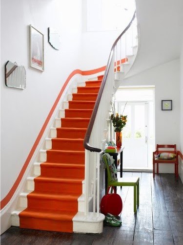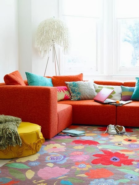 Arredare con l’arancione.Interno eclettico in arancione. QUI un bellissimo tappeto arancione stampa chevron insieme ad altre proposte di fantasie