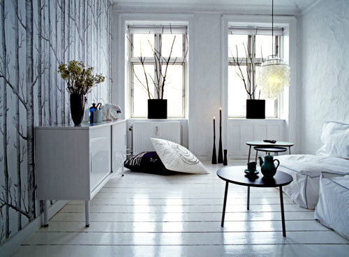 Se volete ricreare questo bellissimo interno candido procuratevi un lampadario di carta, un tappeto a pelo lungo , un divano bianco e un tavolino bianco