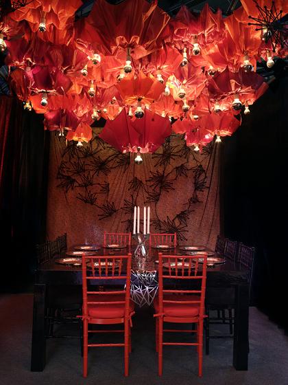 Gli Ombrelli Semichiusi sul Soffitto di Questo Spazio Contribuiscono a Creare una Perfetta Atmosfera Noire