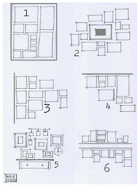 I bravi architetti consigliano vari metodi per organizzare i quadri su una parete onde evitare di combinare pasticci. 1) C’è chi suggerisce di fare delle sagome con la carta di giornale ed organizzarle come prova sul muro prescelto.
