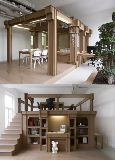 Ma senza arrivare all’estremo dei designer olandesi si possono realizzare uffici in cartone anche con gli arredi in cartone come nel caso di questa agenzia di comunicazione arredata con scrivanie di Corvasce