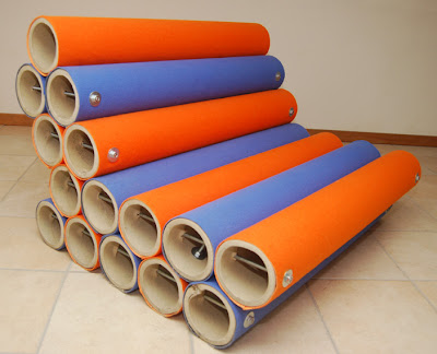 Con i tubi di cartone da plotter, che il bravo architetto, di una certa età , ben conosce, si possono realizzare molte cose, da mobili a pareti ad interi allestimenti.