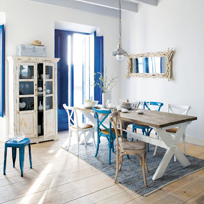 Questo è il modo in cui definisco il rustico marinaro nel quale troveremo legno bianco decapato, azzurri e bianchi, vimini, paglia e legnetti come elementi decorativi.