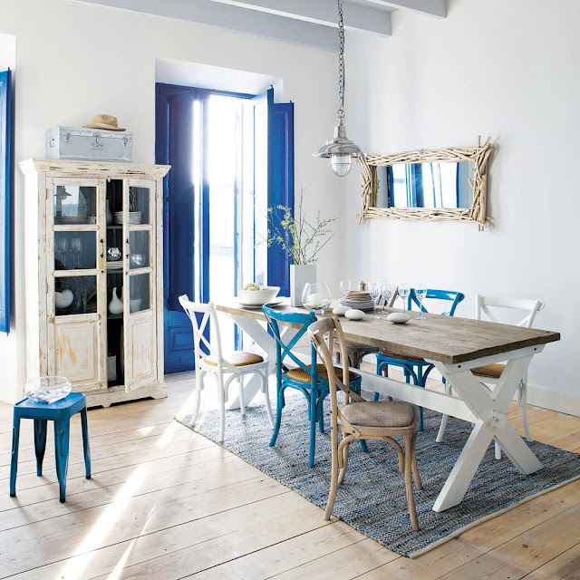 Questo è  il modo in cui definisco il rustico  marinaro nel quale troveremo legno bianco decapato, azzurri e bianchi, vimini, paglia e legnetti come elementi decorativi.